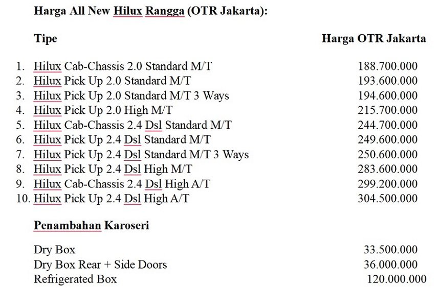 “Toyota secara resmi mengumumkan bahwa terdapat 10 opsi line-up All-New Hilux Rangga, dengan 2 line up konversi Toyota. Spektrum fungsi Hilux Rangga menjadi sangat luas dan multiguna, baik untuk bisnis, layanan publik, hingga hobi dan utilitas harian. Dengan harga mulai dari Rp 188 juta untuk mesin bensin dan Rp 244 juta untuk mesin diesel, All-New Hilux Rangga merupakan partner terbaik dalam mewujudkan potensi yang lebih besar, baik dalam bisnis maupun kehidupan sehari-hari,” tutup Henry Tanoto.