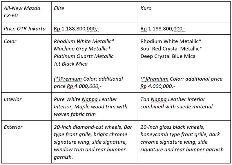 Setelah dijelaskan panjang lebar maka barulah ditebar banderol All-New Mazda CX-60 yakni sekitar Rp 1,2 miliar atau pastinya Rp 1.188.800.000 on the road Jakarta, baik untuk Kuro dan Elite.