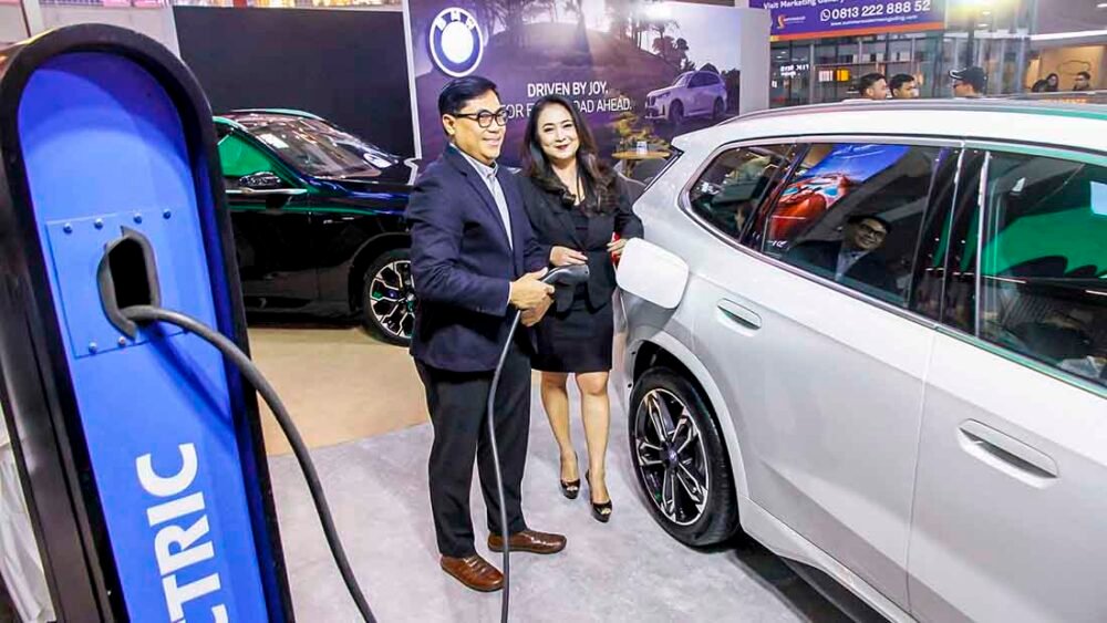 Jakarta, NextID – Director of Marketing BMW Indonesia, Bayu Riyanto bersama Director of Communications BMW Group Indonesia, Jodie O’tania simbolis pengisian baterai mobil listrik dalam ajang BMW Exhibition di The Forum, Mall Kelapa Gading, Jakarta Utara, Rabu (17/9/2025).