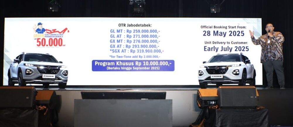 Harga penjualan yang kompetitif tersebut semakin menarik dengan penawaran spesial. Bagi calon konsumen yang melakukan pembelian Suzuki Fronx mulai 28 Mei hingga September 2025, Suzuki memberikan program khusus senilai Rp 10.000.000 untuk seluruh varian di seluruh wilayah Indonesia.