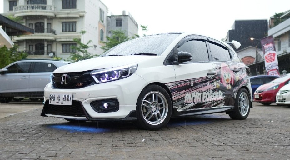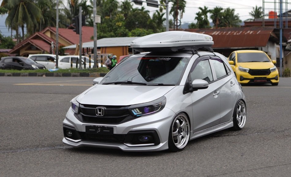 Honda Brio asal Padang tampil penuh modifikasi dengan kombinasi gaya sporty dan stance. Tampilan depan menggunakan headlamp custom Brio facelift Biled Vahid E.10 + RGB, ditambah foglamp mini laser, bumper Mobilio RS, hingga air suspension Airgen agar ground clearance dapat diatur sesuai kebutuhan show. Velg Lenso 17 inci memperkuat tampilan roda, sementara interior dilengkapi sistem audio berkelas kompetisi seperti HU Asuka AK2000, prosesor Zivox 8 channel, dan subwoofer Kicker Solobarik. Kabin juga dirapikan dengan jok microfiber premium untuk kenyamanan dan estetika.