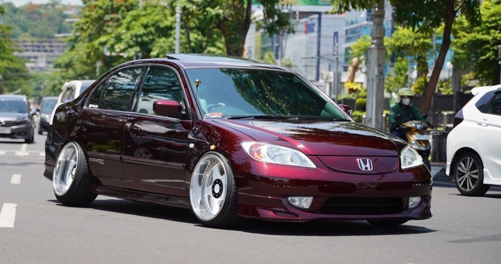 Honda Civic ES dari Semarang tampil mencolok lewat warna red candy dan tambahan moonroof. Banyak komponen custom seperti retractable mirror, headlamp dan front grill custom, ducktail dan lips RX depan-belakang, serta velg 3pcs R18 dengan camber kit dan suspensi custom yang memperkuat tampilan fitment. Interior dibuat premium dengan audio setup dan finishing kabin custom, sementara sektor performa diperkuat knalpot Kansai 421 dan muffler Fujitsubo serta penggunaan stutbar custom untuk handling lebih baik.
