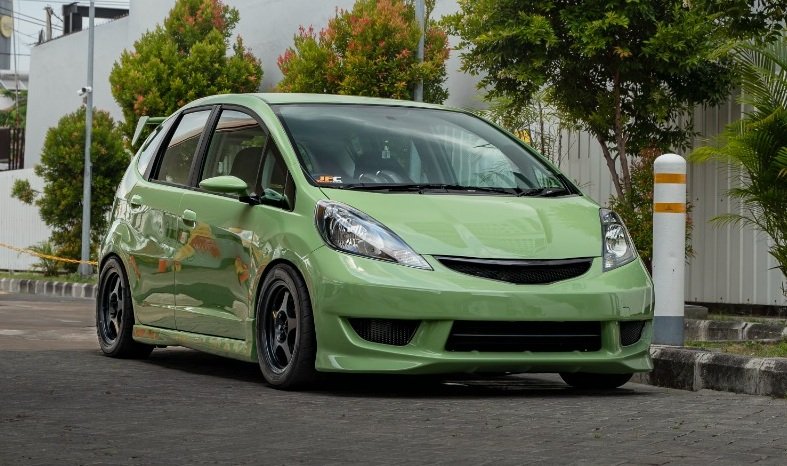 Honda Jazz berwarna sage green ini mengusung gaya Spoon Sports oriented. Hampir seluruh elemen eksterior hingga engine bay dikustom menggunakan komponen Spoon — mulai dari velg, muffler, big brake kit, lugnut, spoiler, hingga berbagai cover pada mesin. Interior dilengkapi dengan jok Bride, seatbelt Takata, hingga komponen OEM Fit RS Japan yang membuat kabin semakin sporty. Performa diperkuat lewat remap ECU, downpipe sampai strutbar Cusco untuk kestabilan di berbagai kondisi jalan.