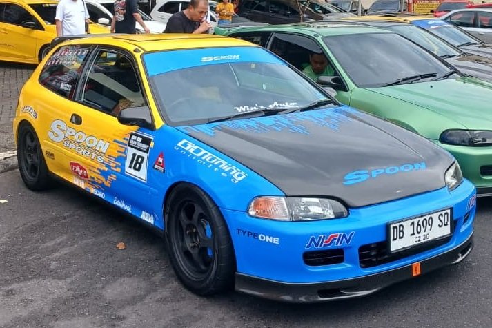 Honda Estilo Manado ini hadir dalam konsep full Spoon livery yang sangat ikonik. Hampir seluruh panel eksterior berbahan karbon: kap mesin, bagasi, spion, handle, spoiler, hingga lips dan fender bar. Kaki-kaki diperkuat full suspension Tein dan lengan Hardrace lengkap. Di sektor performa, transplant mesin K20A Type R lengkap dengan Hondata ECU membuatnya memiliki performa yang jauh di atas standar — salah satu modifikasi paling ekstrem di kompetisi regional tahun ini.
