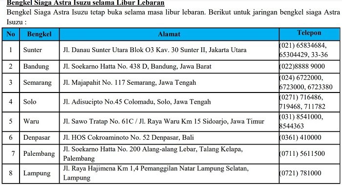 Astra Isuzu memberikan layanan pada 8 titik bengkel siaga dan 6 titik posko siaga guna mendukung Astra Siaga Lebaran. Ist