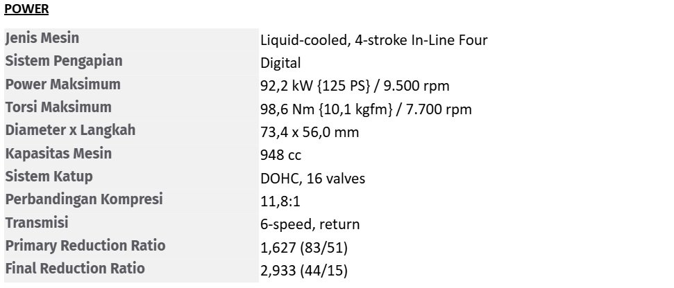 Kawasaki Z900 dilengkapi dengan mesin 948cc In-Line Four yang memberikan tenaga kuat dengan respons cepat pada setiap putaran throttle. Dengan sistem suspensi depan inverted fork dan suspensi belakang horizontal back-link, Z900 memberikan handling yang ringan dan stabil di berbagai kondisi jalan.