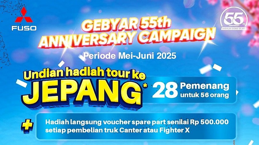 “Kami sangat berterima kasih atas kepercayaan dan dukungan para konsumen selama 55 tahun ini. Bagi kami, para pengusaha, pengemudi, mitra dealer, bukan hanya sekadar konsumen namun menjadi bagian penting dalam perjalan Mitsubishi Fuso. Melalui program undian dan promo spesial ini, kami ingin memberikan apresiasi atas loyalitas konsumen sekaligus terus memperkuat hubungan baik dengan para konsumen,” ujarnya. Sabtu (17/5).