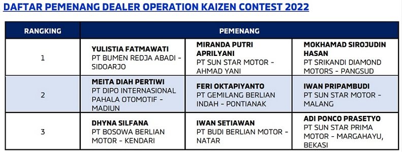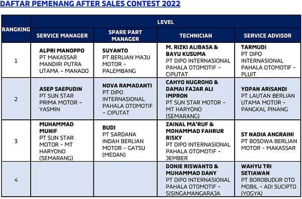 “Kebutuhan konsumen atas produk maupun layanan kami terus berkembang. Begitupun kami yang harus turut menyesuaikan diri dengan kebutuhan konsumen untuk dapat mempertahankan dan meningkatkan kepuasan mereka. Dari sisi layanan, ajang National Contest ini menjadi salah satu upaya kami untuk memastikan dealer berserta SDM-nya memaksimalkan layanan yang ada dan mengimplementasikan standar terbaik yang telah ditetapkan oleh kami,” ujar Naoya Nakamura Presiden Direktur MMKSI.