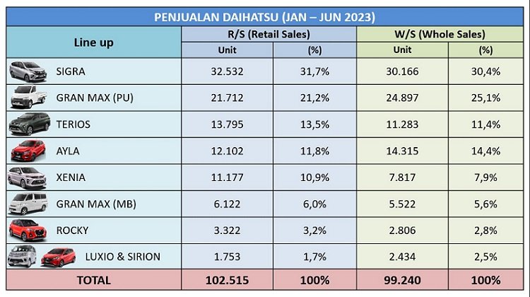 Secara volume dan kontribusi model, penjualan ritel Daihatsu selama 1 Semester di tahun 2023 ini tetap didominasi oleh top 3 model, seperti Sigra sebanyak 32.532 unit, atau berkontribusi sekitar 31,7%; disusul Gran Max PU (Pick Up) 21.712 unit (21,2%); dan Terios 13.795 unit (13,5%).