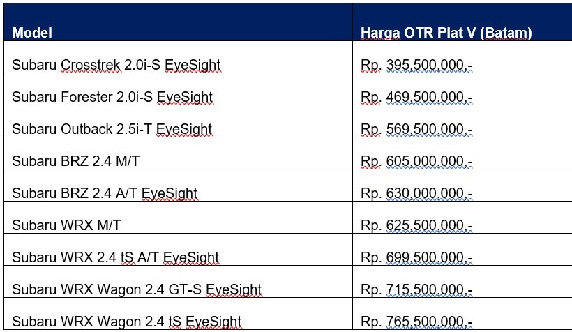 “Batam adalah daerah penting untuk Subaru, kami membuka dealer kedua Plaza Subaru mulai tahun 2022 karena yakin akan potensi pasar yang ada. Di awal tahun 2024 ini sendiri kami telah menyesuaikan produk dan layanan yang sesuai dengan keinginan masyarakat Batam dengan wujud peluncuran pricelist baru untuk harga Batam (Plat V) yang membuat kendaraan kami semakin memberikan value terbaik jika dibandingkan dengan Subaru core-technology yang ditawarkan pada setiap model terbaru kami,” ujar Arie Christopher, CEO Subaru Indonesia..