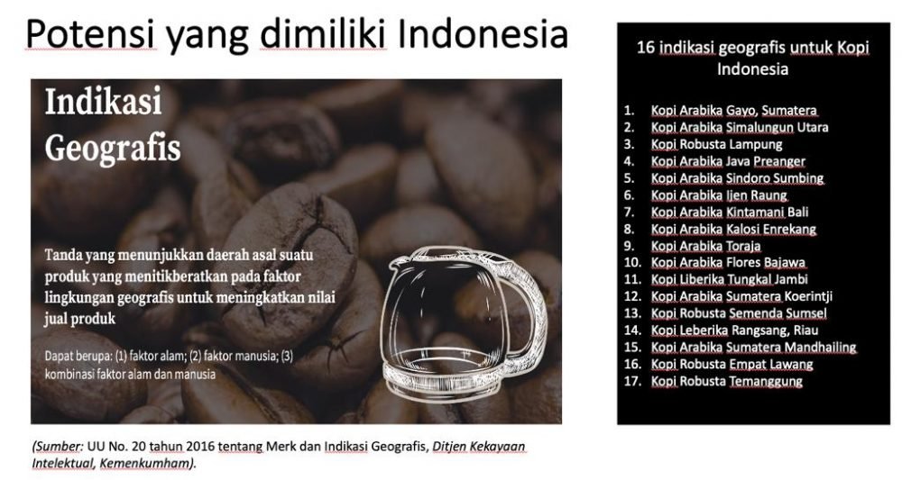 Potensi lain yang dimiliki Indonesia adalah indikasi geografis yang mendapat pengakuan internasional. Menurut UU No. 20 tahun 2016 tentang Merk dan Indikasi Geografis, saat ini 17 wilayah telah diakui daerah paten, antara lain Kopi Arabika Sumatera Koerintji. Guna mencegah pemalsuan produk kopi maka teknologi ketelusuran diyakini dapat membantu konsumen dan produsen dalam memastikan keaslian kopi.