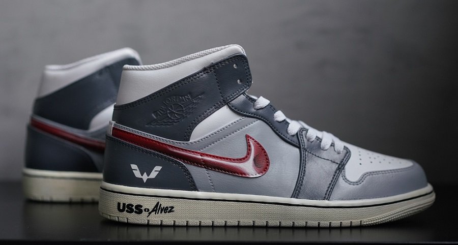 Abu-abu tua diambil dari varian Tungsten Steel Grey yang diaplikasikan di bagian heel tab dan back heel. Kemudian, abu-abu muda yang mewakili aksen Aurora Silver mewarnai bagian tengah sepatu. Selain LED rear lamp, pemilihan warna merah pada bagian Swoosh turut terpengaruh dari warna Carnelian Red. Kemudian, di beberapa bagian sepatu dibubuhkan warna putih dan tali sepatu putih yang melambangkan Pristine White. Tidak ketinggalan, pada area mid sole terdapat logo Urban Sneaker Society dan tulisan Alvez bergaya street style. Logo Wuling pun digambar pada back heel sebagai statement dalam kolaborasi ini.